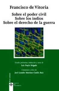 Francisco de Vitoria (Burgos, 1483-Salamanca, 1546), teólogo y jurista dominico, pertenece al movimiento renovador del humanismo hispano. Estudió en el convento de Santiago que tenía su orden en París, en cuya Universidad estuvo en contacto con eminentes teólogos y humanistas. Fue también profesor en su convento. Vino a España a ejercer el magisterio en el colegio de San Gregorio de Valladolid y después, desde 1520 hasta su muerte, desempeñó la cátedra de Prima de la Universidad de Salamanca. Además de renovar la teología escolástica, hizo importantes aportaciones en el campo del derecho, sobre todo explicando el derecho de gentes con sentido renovador: se le reconoce como el fundador del Derecho Internacional moderno. En este ámbito, entre sus obras destacan tres relecciones : Sobre el poder civil, Sobre los indios y Sobre el derecho de la guerra; y los comentarios a la Suma: sobre La Ley y sobre La Justicia.